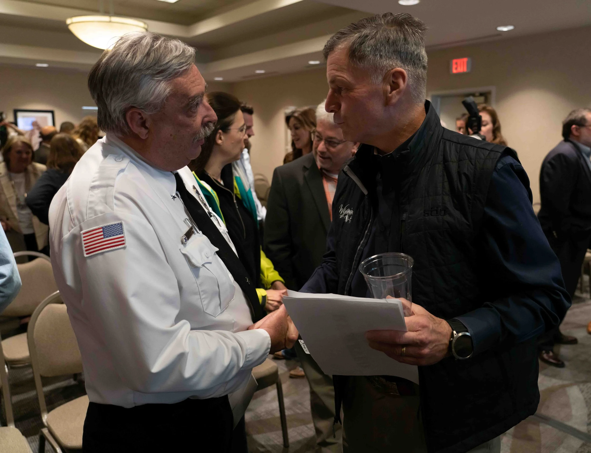 Gov. Mark Gordon speaks to local residents and officials during a meeting Friday at a hotel in Kemmerer as Bill Gates looks on. Gates' nuclear development company is planning to build a next-generation reactor at the site of a coal-fired power plant adjacent to the town. This was the Microsoft founder's first visit to the community. Ashton J. Hacke, for the Star Tribune
